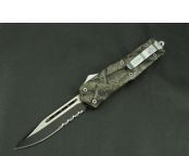 新版伤齿龙单锋半齿(披履) 全 长: 23cm 刃 长: 9cm 刃 厚: 2.8mm 刃 材: 440 硬 度: 57HRC 刀 重: 220g 毛 重: 340g 表 面: 氧化白 柄 材: 锌铝合金(被履) 刀 鞘: 尼龙 锁 闭: 直出弹簧刀