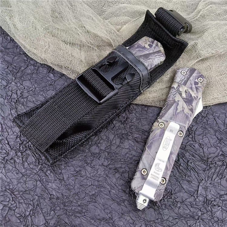 全 长: 23cm 刃 长: 9cm 刃 厚: 2.8mm 刃 材: 440 硬 度: 57HRC 刀 重: 220g 毛 重: 340g 表 面: 氧化白 柄 材: 锌铝合金(被履) 刀 鞘: 尼龙 锁 闭: 直出弹簧刀
