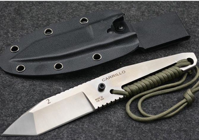 Dwaine Carrillo硬汉军刀NO.2 材 质:9cr18mov 全 长:20.3cm 刃 长:9cm 刃 厚:0.7cm 刃 宽: 3.3cm 刀 重量: 400克(包括盒子) 表 面:砂光拉丝 硬 度:59-60HRC(真空热处理) 手 柄:一体刀柄,CNC 成型 刀 鞘:战术K鞘(进口Kydex板)