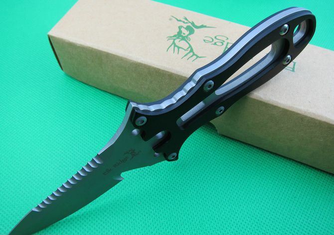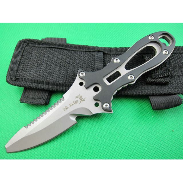 Elk Ridge.鹿头牌求生潜水刀 全 长:19.9cm 刃 长:8.0cm 柄 长:10.0cm 刃 宽:3.0cm(最宽处) 刃 厚:3.3mm 刃 材:440 硬 度:57HRC 刀 柄:直身全钢柄,两面外夹铝片 表 面:喷砂 重 量:240.0克 其 他:刀刃锋利,带割绳回钩,刀背带背齿;尼龙刀套,配绑腿带。