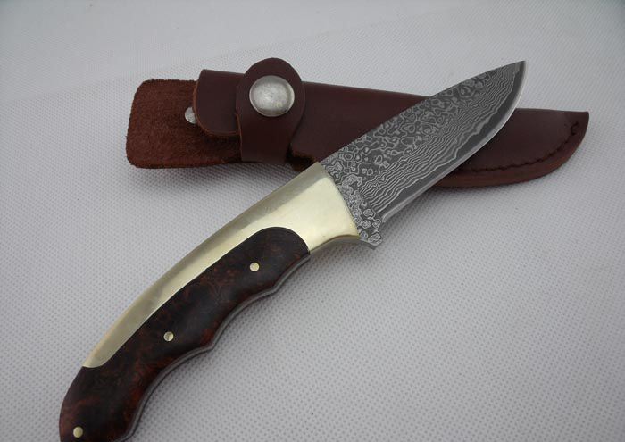 全 长: 20.5cm 刃 长: 9.5cm 刃 宽: 3.0cm(最宽处) 硬 度: 58HRC 刃 厚: 0.32m 柄 长: 11cm 柄 材: 珍稀红影木+纯铜 刃 材: 进口大马士革钢 表 面: 大马士革钢特有的花纹原色 其 他: 刃口锋利,真皮套 大马士革钢花纹和把手木纹及颜色各异,以实物为准!