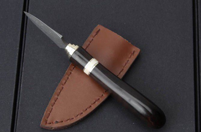 大马士革钢高端普洱茶刀 全长:165mm 刃长:60mm 柄长: 105mm 刃材:日本进口大马士革钢 马士革花纹和把手木纹及颜色各异,以实物为准
