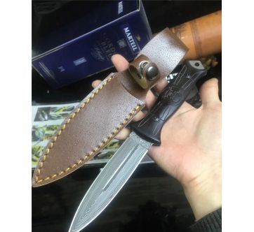 大马士革骷髅双刃收藏刀 全 长: 24.6cm 刃 长: 11.5cm 刃 宽: 2.6cm(最宽处) 柄 长: 12.6cm 刃 材: 大马士革 硬 度: 59 HRC 表 面: 电脑浮雕精美图案 刃 厚: 0.3cm 柄 材: 高档黑檀木 净 重: 160g 总 重: 220g 包 装:彩合 品 质: 品质卓越