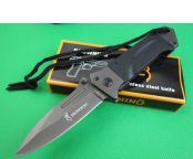 勃朗宁DA35-2快开折刀 全 长:220mm 刃 长:92mm 柄 长:127mm 刃 宽:27mm 刃 厚:3.5mm 刃 材:8Cr14Mov 重 量:230g(含包装) 硬 度:58HRC 表 面:镀钛 柄 材:黑G10柄 锁 型:快开线锁