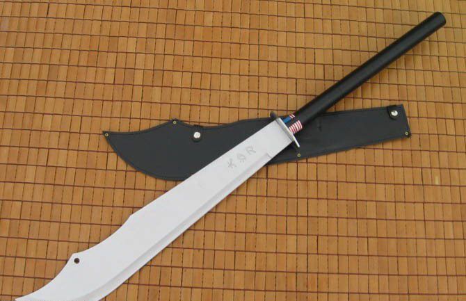 规格:CM 接上全长:133 未接全长:97cm 刃长:52 刃厚:0.35 刃材: 420不锈钢 刀刃硬度: 55HRC 表面处理:沙光 刀柄:铁管 刀鞘:假皮 重量:1900克(含套)