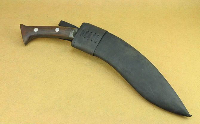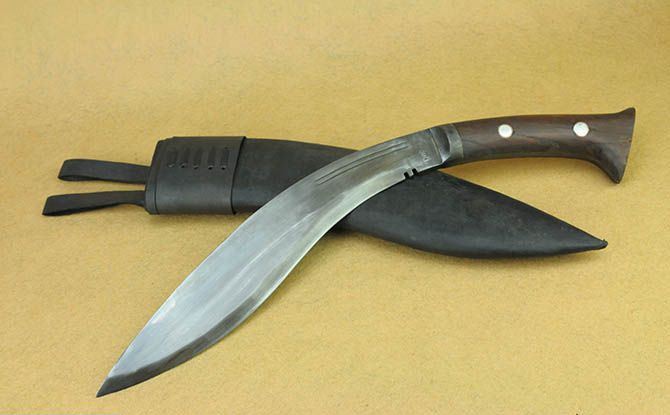 廓尔喀灰狼弯刀 全长:47cm 刃长:31cm 柄长:16cm 刃宽:5.3cm 刃厚:10mm 总重:1300g (含皮套) 刃材:高碳钢 刀套:原木包皮 柄材:红酸枝 硬度:59HRC 性能:半开刃