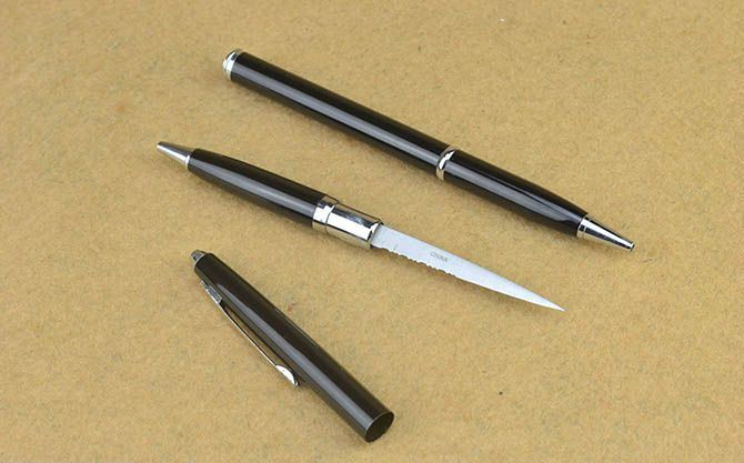 002多功能圆珠笔刀(黑色半齿) 总长:13.5cm 刃长: 5.6cm 刃厚:0.12cm 刃宽:0.6cm 刃面:砂光 重量:17克 巧妙地将圆珠笔和小刀功能组合成一体,小巧便携,是理想的防卫工具,笔杆采用薄铜管.