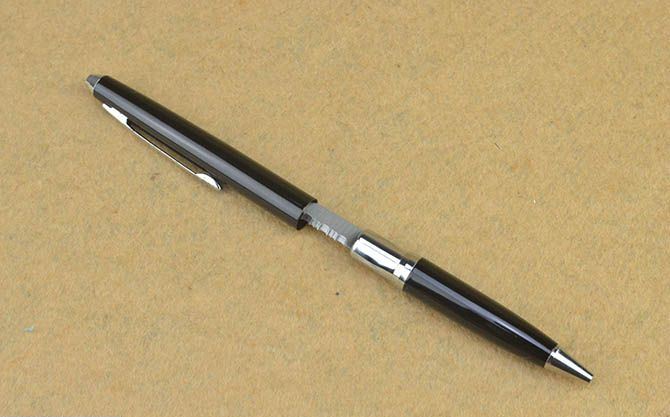 总长:13.5cm 刃长: 5.6cm 刃厚:0.12cm 刃宽:0.6cm 刃面:砂光 重量:17克 巧妙地将圆珠笔和小刀功能组合成一体,小巧便携,是理想的防卫工具,笔杆采用薄铜管.