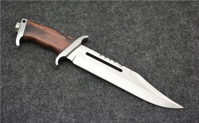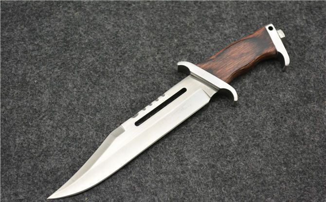 兰博三(迷你版) 全长:18cm 刀刃:12cm 刃厚:0.3cm 刃宽:2.2CM 柄长:6cm 柄材:进口彩木 净重:70克 表面处理:纯手工砂光 兰博刀以其剽悍的外形,强大的功能,吸引了众多真正玩刀的朋友.刀身造型适合于切割、劈砍、突刺,刀背有大而强悍的背齿.刀锋十分精细和锋利。本款迷你款兰博刀3是好莱坞公司电影公司的旅游纪念款,按比例缩小迷你款,具有很高的收藏与实用价值。