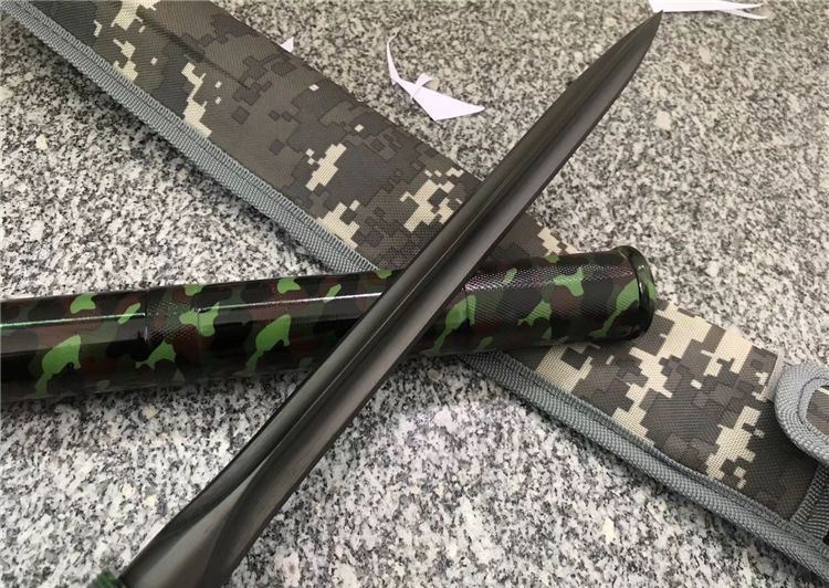 完全反接长度:72.6CM 刃长:24.5CM 完全正合长度:44.2CM 管径:3.2CM 刀径:1.8CM 重量: 930g 硬度: 56HRC 刀材质:440不锈钢 管材: 不锈钢管 柄材: 合金铝 表面:迷彩(不易刮花) 其他:三面血槽 配件;原厂彩盒。高档耐磨加厚尼龙套