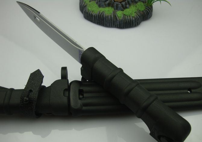 苏联AK74刺刀M3 全长:29.3CM 刃长:14CM 柄长:13.2CM 宽度:3.CM 刀厚:0.35CM 刀重:100克 毛重:410克 钢材:9CR17MOV钢 硬度:58 刀柄:尼龙+纤维 刀鞘:尼龙+纤维