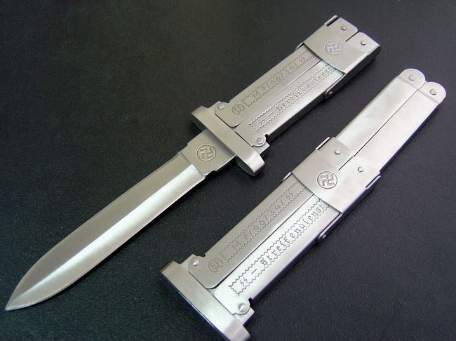 说明:德国纳粹青年团随身的短匕首,隐蔽型非常好,折叠起来压根看不出是刀,从刀身上的文字看仿佛能看到二战时期德国青年狂热的黩武精神!文字经过翻译是纳粹口号“血与荣誉”。刀柄刻有纳粹德国的纳粹标志。