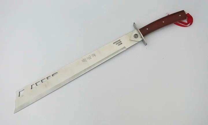 总长:69.5CM 刃长: 52CM 刃材: 420 硬度: 54-56HRC 表面: 沙光 刃厚: 0.3cm 柄长: 17.5cm 柄材: 全钢通柄+原木 重量: 770克 尼龙鞘