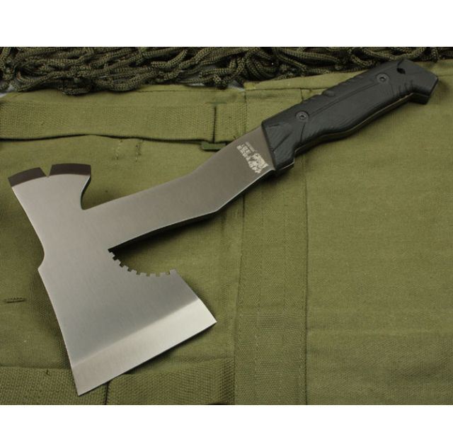 熊出没-圣殿神斧 全 长: 31cm 刃 长: 15cm 柄 长: 14cm 刃 材: 5Cr13 硬 度: 56 HRC 表 面: 镀钛金 刃 厚: 0.6cm 净 重: 800g 柄材:进口橡塑(耐高温) 其 他:上下开锋,附尼龙套和彩盒