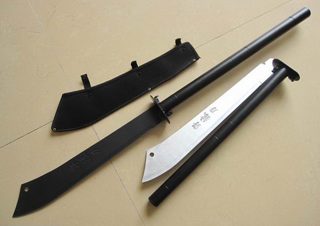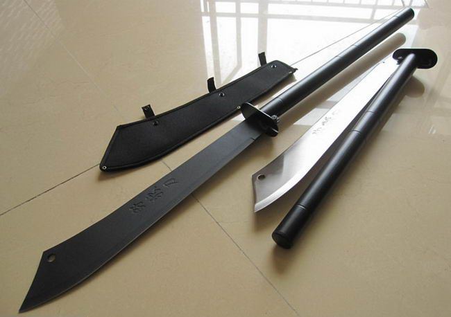 打开全长:96cm闭合长(管柄长度):50cm刃 长:45.5刃 厚:0.3刃 材: 420不锈钢刀刃硬度: 55HRC表面处理:粗纹黑漆刀柄材料:铁管刀 鞘:尼龙套重 量:1050克(含套)