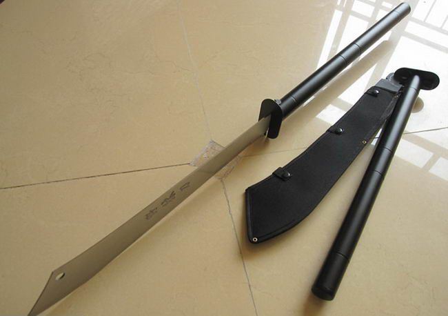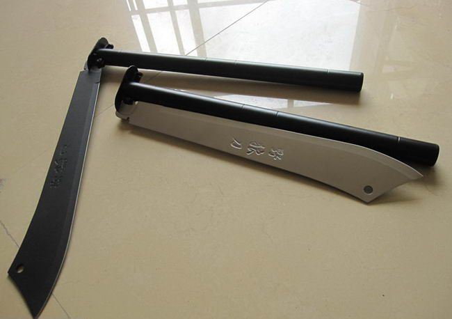 该刀实为大沙刀的折叠型,身材比大沙刀稍微缩小了一点。携带方便,隐秘性强。拉动手柄顶端的弹簧开关,即可将刀身折叠起来。直接拔开刀身就可打开,非常方便。打开之后比较牢固,实用性较强。不过,关闭的时候一定要小心,不要被闸到手了。