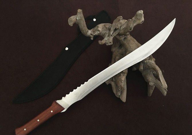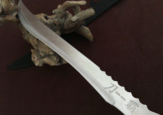 一体刀霸 全 长:68cm 刃 长:50cm 柄 长:18cm 刃 厚:50mm 刃 宽:4cm 合 重:720g(连刀套) 钢 材:440 柄 材:红木