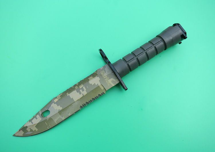 M9军刀半迷彩(可拆卸) 全 长: 31cm 刃 长: 18.2cm 刃 厚: 6mm 刃 材: 5CR13 硬 度: 58HRC 表 面: 高温喷漆 柄 材: ABS 刀 鞘: ABS
