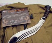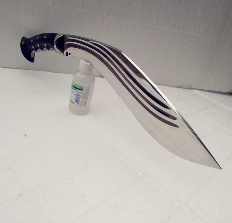 进口尼泊尔血魔弯刀 长度:51厘米左右 厚度:1厘米左右 宽度:6.2厘米左右 硬度:59-61左右 刃材:进口高碳钢 柄材:非洲小叶紫檀 标配:牛皮刀鞘一个 辅刀两把