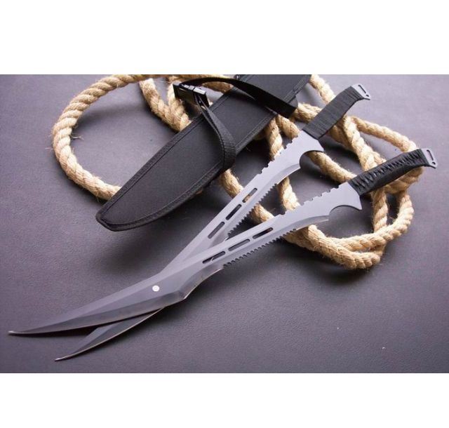 狼牙双忍者 全 长: 68.8cm 刃 长: 45cm 刃 厚: 3mm (单独一把刀的厚度) 刀 宽: 4.4CM(最宽处) 材 料: 420 硬 度: 54HRC 重 量: 930g(含鞘) 表 面: 黑漆 柄 材: 一体柄,绕带 刀 鞘: 尼龙
