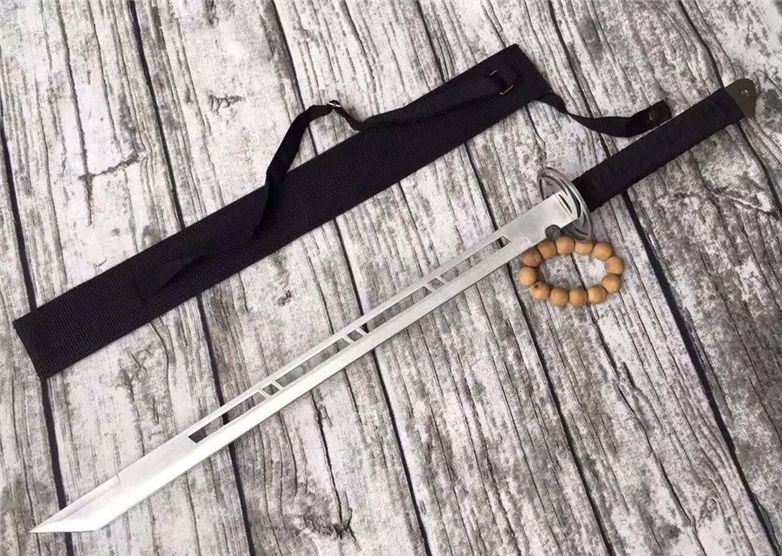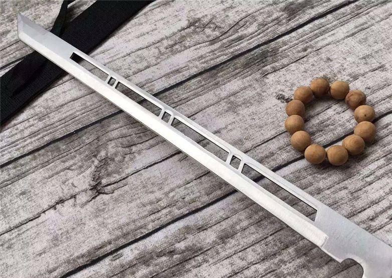 全 长: 71.5cm 刃 长: 50cm 刃 厚: 3mm 材 料: 420不锈钢 硬 度: 54-56HRC 重 量: 375g(含尼龙套) 表 面: 黑漆 柄 材: 全钢柄,绑绳 刀 鞘: 尼龙 忍者长刀系列,窄刃圆盘挡手,镂空刃