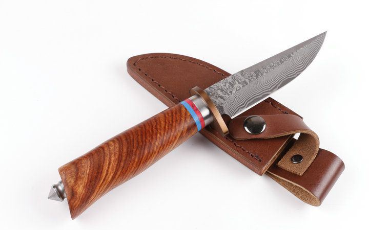 其 他: 配撞击器和真牛皮套,刃口锋利 大马士革钢花纹和把手木纹及颜色各异,以实物为准