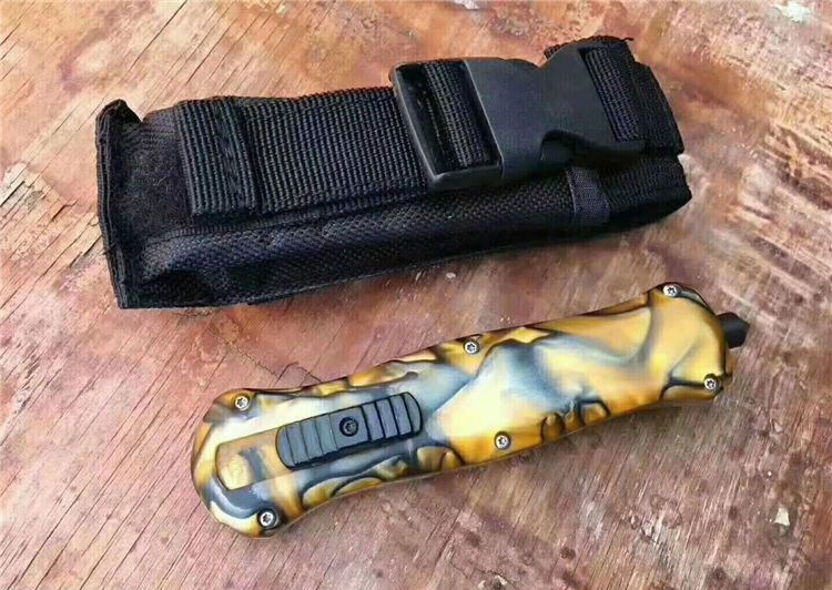 新版蝴蝶蜂王刺(黄柄、翡翠绿柄) 全 长: 23cm 刃 长: 9.6cm 刃 厚: 2.8mm 刃 材: 440 硬 度: 57HRC 刀 重: 201g 毛 重: 277g 表 面: 氧化黑 柄 材: 锌铝合金+树脂 刀 鞘: 尼龙 锁 闭: 直出弹簧刀