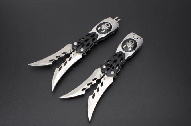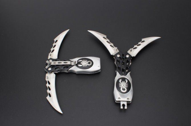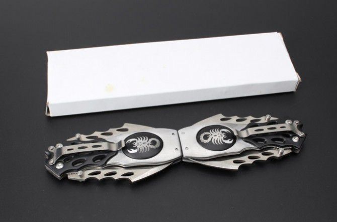 黑眉蝎子连环战术折刀(双刀) 全 长:19cm 刃 长:8.5cm 刃 厚:2.5mm 刃 材:420A 硬 度:56Hrc 表 面:电泳 柄 材:合金铝 净 重:242g 双刀 刀 套:无 锁 定:线锁 备 注:两把连接可拆