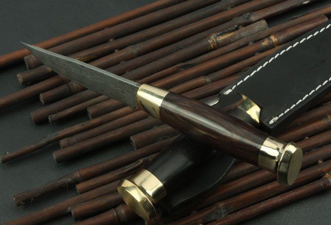 大马士革龙腾刀 全 长: 23.7cm 刃 长: 10cm 柄 长: 11.8cm 刃 宽: 3cm(最宽处) 硬 度: 58HRC 刃 厚: 0.28cm 柄 材: 双铜头+黑檀木 重 量: 252克(含包装) 刃 材: 进口大马士革钢 表 面: 大马士革钢特有的花纹原色 大马士革钢花纹和把手木纹及颜色各异,以实物为准!