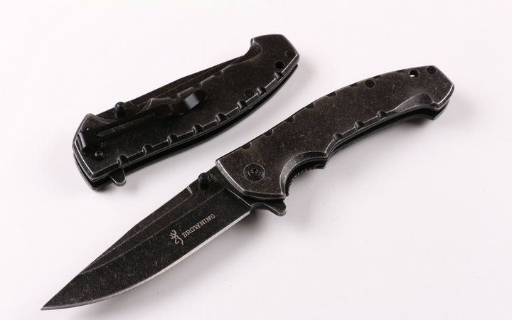 勃朗宁DA78快开折刀 全 长:22cm 刃 长:10.2cm 刃 宽:2.8cm(最宽处) 刃 厚:3.7mm 柄 长:12.5cm 表 面: 石洗+黑钛 刃 材: 440C 硬 度: 57HRC 柄 材: 全钢片 重 量:250克(含彩盒子) 锁 闭:线锁 备 注:带腰夹
