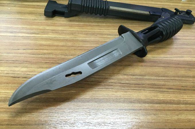 全 长: 28.3cm 刃 长: 16cm 刃 宽: 3.2cm(最宽处) 柄 长: 10.3cm 刃 材: 7cr17 硬 度: 58 表 面: 喷砂 刃 厚: 0.72cm 柄 材: 全钢挖空柄 重 量: 800克 其 他:战术刀鞘(含有锯片,磨刀石),顶端三角合金钢可以配合刀背形成战术大力剪