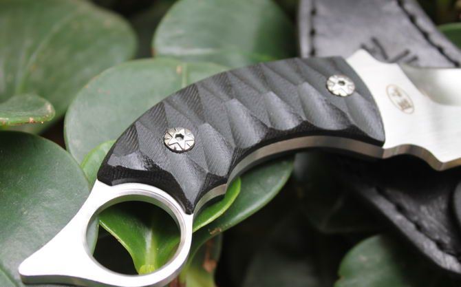 漠江魔爪刀 全 长: 21.5cm 刃 长: 10cm 刃 宽: 3cm (最宽处) 刃 材: 7Cr17 硬 度: 57HRC 表 面: 砂光 刃 厚: 0.5cm 柄 长: 10.2cm 柄 材: 米克塔 重 量:240克(含鞘)