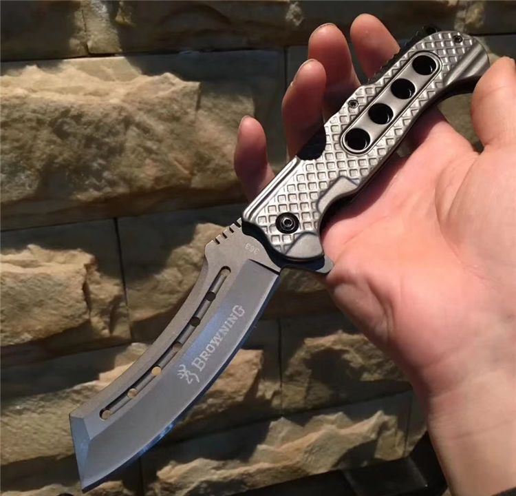 勃朗宁363快开折刀 全 长:228mm 刃 长:95mm 柄 长:123mm 刃 宽:28mm 刃 厚:3.5mm 刃 材:5Cr15Mov 重 量:263g(含包装) 硬 度:57HRC 表 面:镀钛 柄 材:钢柄 锁 型:快开 其 他:配彩盒
