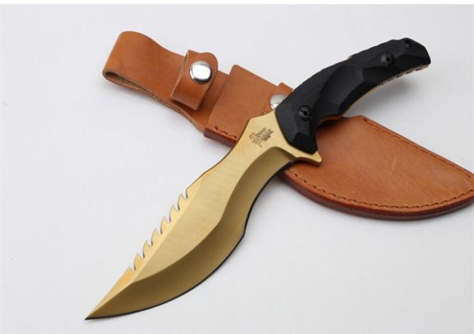 托德贝格终极斗士(黄金版) 全 长:290mm 刃 长:170mm 柄 长:123mm 刃最宽:46mm 刃 厚:5.5mm 刃 材:9cr18mov 重 量:595g(含包装) 硬 度:59HRC 表 面:镀钛 柄 材:钢一体柄+G10 锁 型:定锁 其 他:配牛皮套+牛皮纸盒子