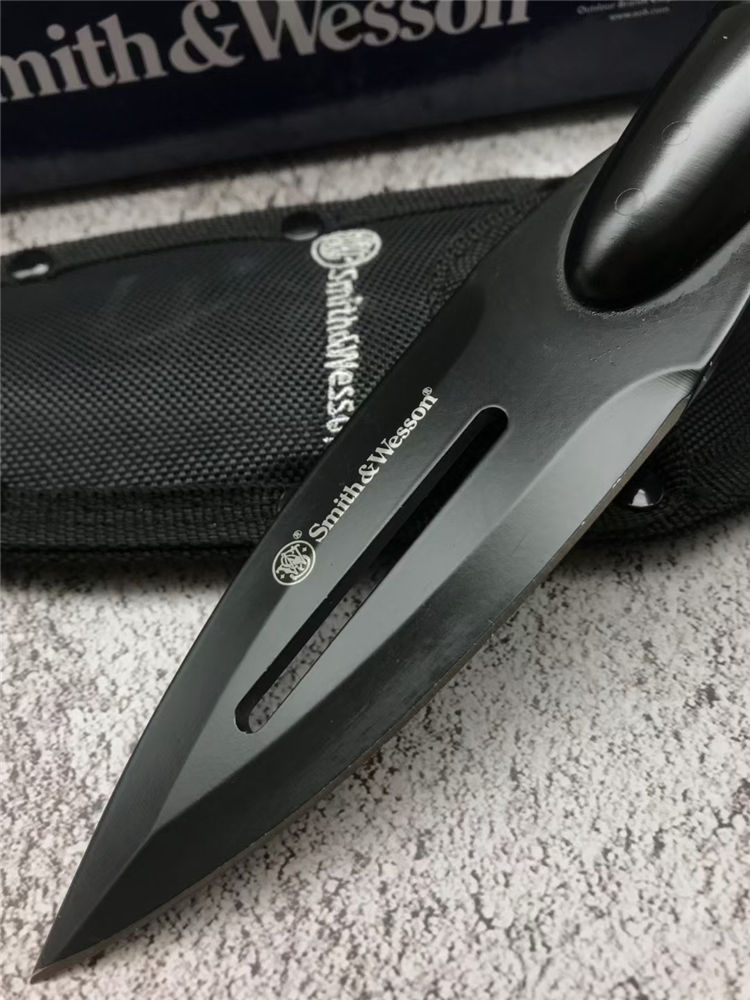 史密斯.威森SW8野战矛 全长:27.5cm 刃长:11.4cm 柄长:12.5cm 刃厚:4mm 刃宽:3.8cm 刃材:440 柄材:G10 硬度:56Hrc 重量:375克 表面:黑色 刀套:尼龙套