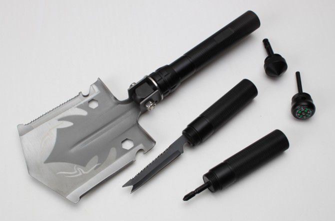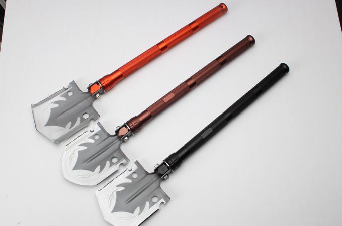 功能:有铲,锄 ,锯,刀,开瓶器,打火棒,撞击器,哨子,指南针,一字十字螺批等功能,在生产工艺上采用上好淬火高碳钢,增加强度,抗磨损,抗腐蚀,耐高温等优势.有把铲在手,登山,外出永不怕