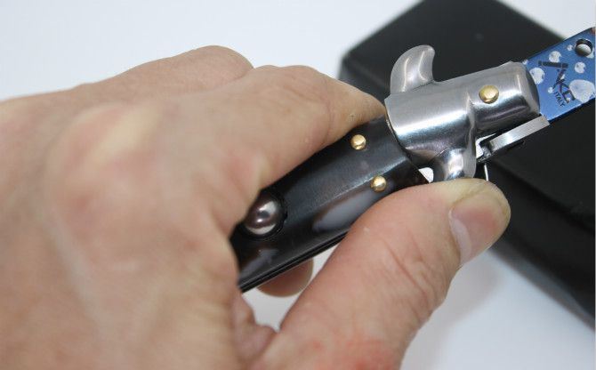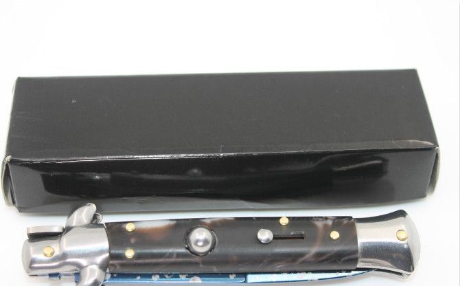 新款9寸AKC意大利黑手党-赌徒跳刀,在电影"教父"里出尽了风头!枪刺刃的黑手党侧跳,白贝柄,弹力超强,锁定到位,440刀刃,带有保险装置,刀护手处暗藏闭合开关,出口产品,质量保证!满足把玩和收藏需要