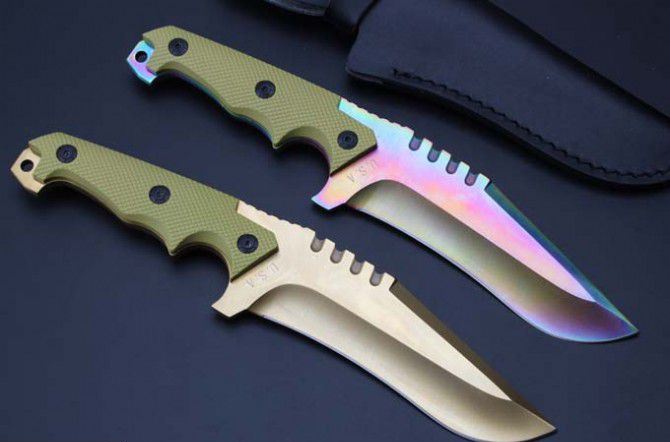 海军陆战队沙漠战鹰 (彩钛、金色) 全长:29.0CM 刃长:16CM 刃厚:0.7CM 刃宽:5.0CM 刃材:9CR18钼 硬度:58HRC 重量:725g仓包装 柄材:G10