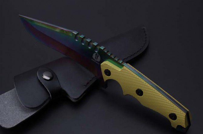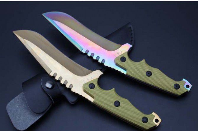 海军陆战队沙漠战鹰 (彩钛、金色) 全长:29.0CM 刃长:16CM 刃厚:0.7CM 刃宽:5.0CM 刃材:9CR18钼 硬度:58HRC 重量:725g仓包装 柄材:G10 刀鞘:牛皮套+彩盒