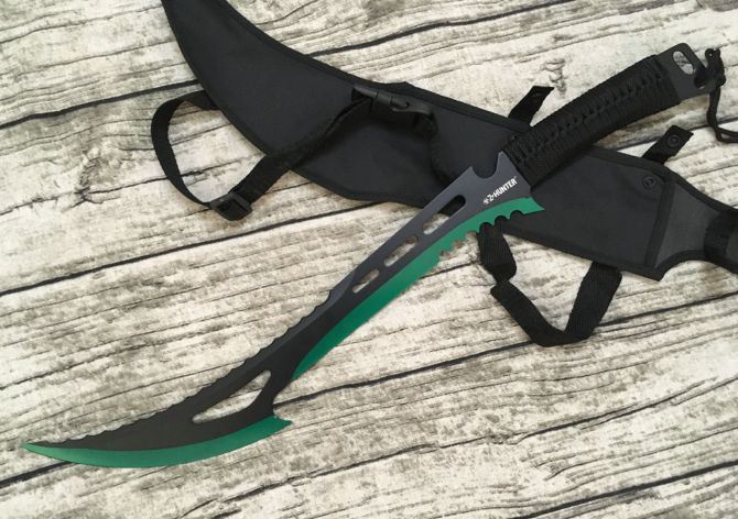 僵尸忍者战刀(绿刃) 全长:61CM 刃长:31.8CM 柄长:16.5CM 刃材:3铬13一体 刀鞘:尼龙