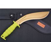 冷钢战俘金狗腿弯刀 全 长: 39.5cm 刃 长: 27cm 柄 长: 13cm 刃 厚: 6mm 刃 材: 不锈钢 硬 度: 58HRC 重 量: 650g 表 面: 镀金钛 柄 材: ABS 刀 鞘: 尼龙