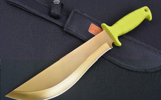 冷钢开拓者金色砍刀 全 长:37cm 刃 长:24cm 柄 长:13cm 刃 厚:6mm 刃 材:440C 硬 度:58HRC 重 量:650g 表 面:镀金 柄 材:ABS