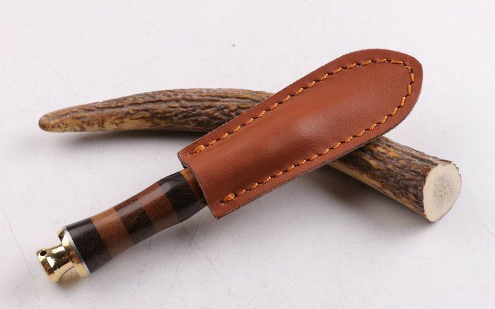 至尊大马士革茶刀 全 长: 15.8cm 刃 长: 5.5cm (无开刃) 刃 宽: 1.5cm(最宽处) 柄 长: 10.2cm 硬 度: 59HRC 刃 厚: 0.4cm 重 量: 75 克(含包装) 表 面: 纯手工制造 刃 材: 大马士革 柄 材: 黄铜头+天然黑檀木+科檀木相间接在一起,所用的材料都经过名刀匠精选过的,不是其它垃圾茶刀. 其 他: 配白盒+真皮套,大马士革钢花纹和把手木纹及颜色各异,以实物为准