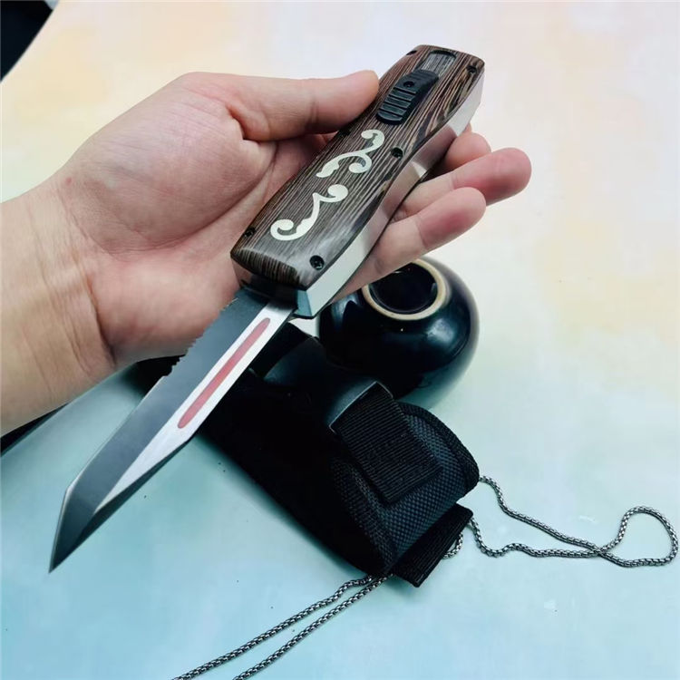 全 长:22.0cm 刃 长:9.3cm 刃 厚:2.2mm 刃 材:D2 硬 度:59HRC 刀 重:283g 毛 重:364g 表 面:镀钛 柄 材:锌铝合金+豹纹木 刀 鞘:尼龙