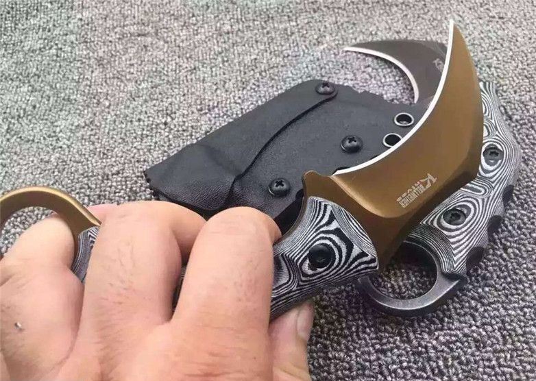 双雄魔兽爪刀 刃材:D2 柄材:黑白G10 全长:17.8厘米 刃长:6.8厘米 刃厚:0.55厘米 硬度:真空热处理58HRC 重量: 226克 表面处理:沧桑石洗,玫瑰金钛