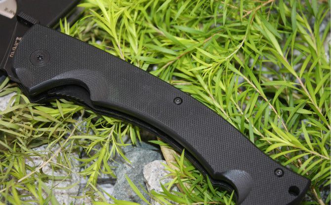冷钢COLD大狗腿折刀(全黑版) 全长:27.2cm 刃长:12cm 柄长:15.cm 刃厚:0.36cm 刃宽: 3.2cm 刃材: 5CR15MOV 柄材: 黑色G10 硬度: 56HRC 净重:250克 锁定:线锁 表面处:全黑色 其他:原厂彩合
