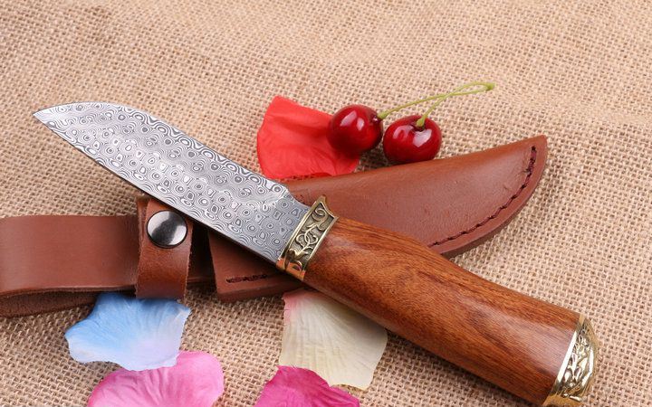 至尊大马士革手工小猎刀 全 长: 23.0cm 刃 长: 11.3cm 柄 长: 11.8cm 刃 厚: 2.8mm 刃 材: 进口大马士革 硬 度: 58HRC 总 重: 270克 净 重: 175克 表 面: 大马士革原有纹 柄 材: 雕纹黄铜钢头+天然酸枝木,高档漂亮 刀 鞘: 皮套 其 它: 刀口锋利.手工制作.值得收藏