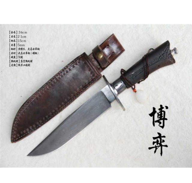 全手工老刀坊博弈大马士革刀 全长:36CM 刃长:21CM 柄长:15CM 刃厚:5CM 柄材:黑檀木、大马士革钢 刃材:大马士革钢 硬度:58 热处理:真空热处理 皮鞘:纯手工制作