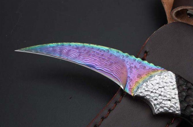 精品蓝钛黑檀木大马士革爪刀 全 长: 17cm 刃 长: 8.1cm 柄 长: 9.12cm 刃 宽: 2.4cm(最宽处) 硬 度: 59HRC 刃 厚: 0.35cm 柄 材: 大马士革钢头加黑檀木 重 量: 240克含包装 刃 材: 大马士革 表 面: 蓝钛