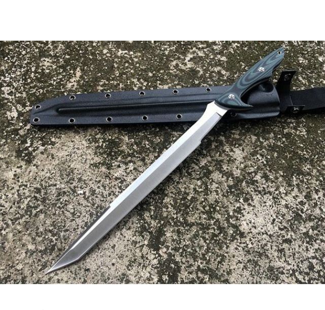 定制版长刀暴徒护卫刀 全长: 47.5cm 刃长: 30.2cm 柄长: 15.2cm 刃厚: 0.5cm 刃宽: 2.7cm 刃材: 9CR18 柄材: 双色G10 硬度: 59-60HRC 净重: 580克 刀鞘: 战术K鞘(进口Kydex板)